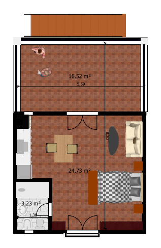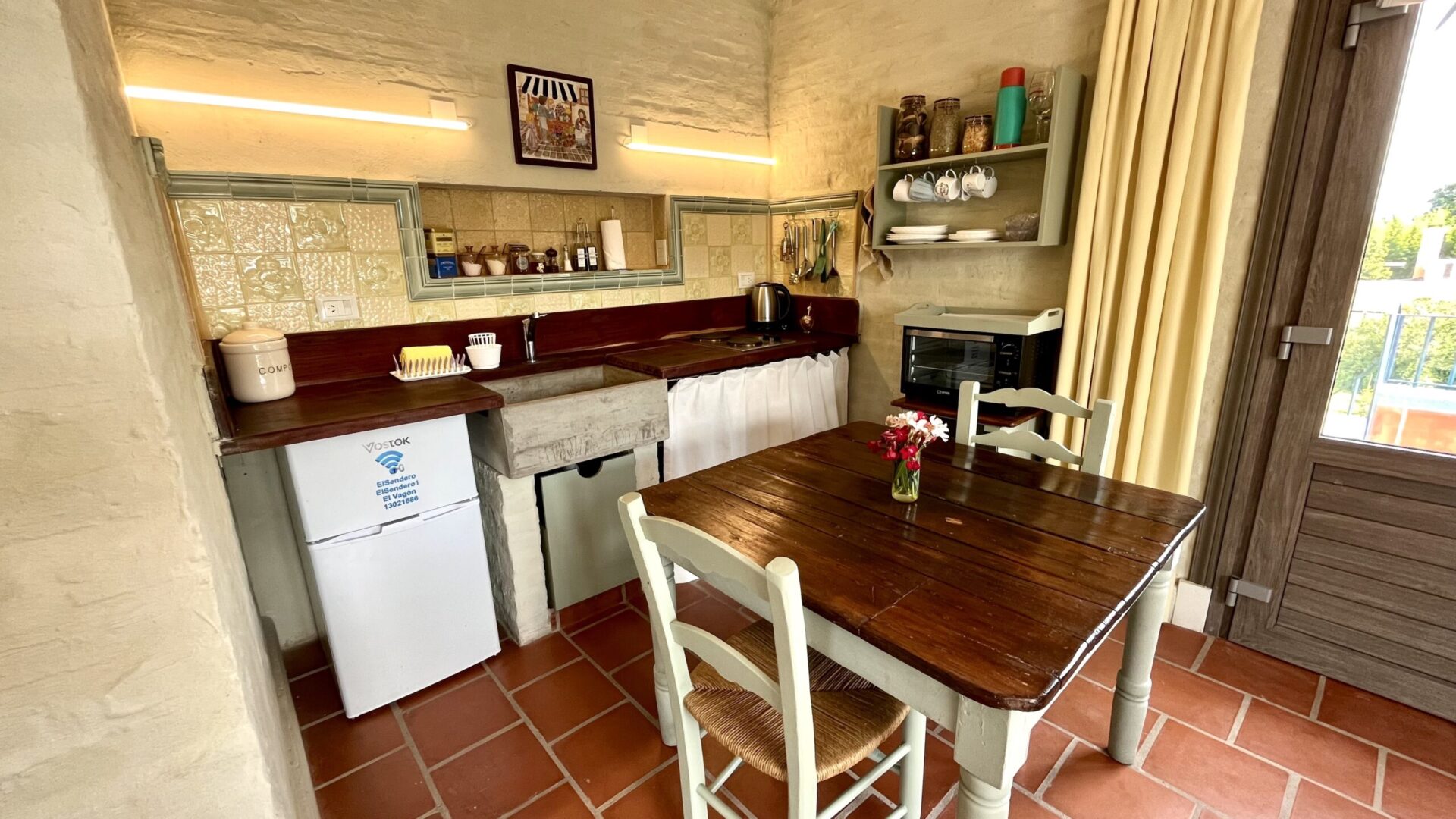 Cocina equipada con horno eléctrico, heladerita, anáfe con dos hornallas, pava eléctrica y utensilios de cocina
